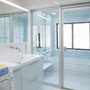 扉をすべてガラス張りにし、青いパネルが